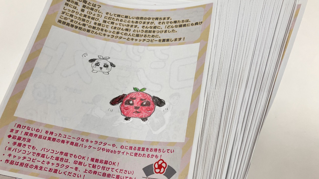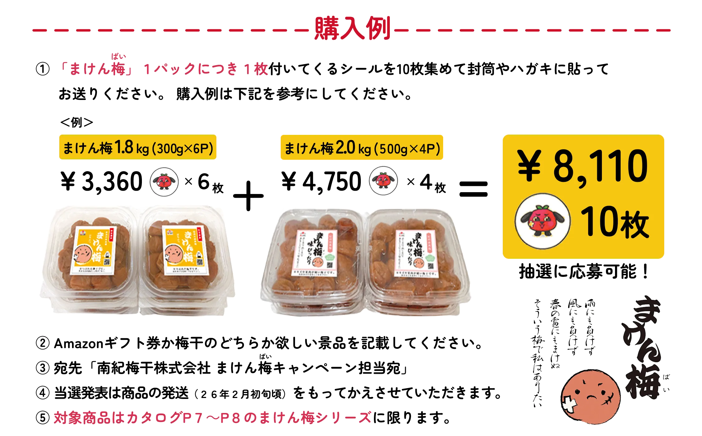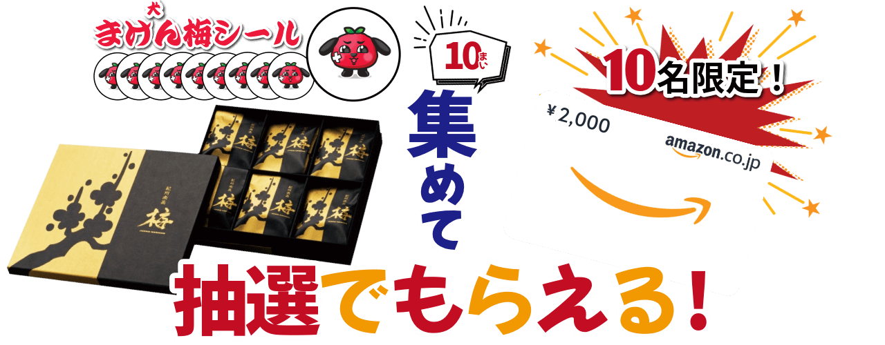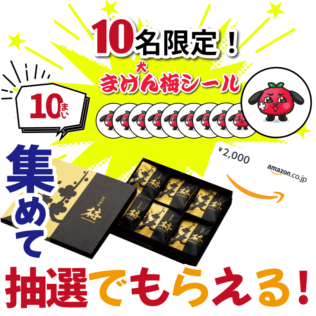 ①通販サイトで「まけん梅」を購入いただき、1パックにつき1枚付いてくるまけん犬梅シールを10枚集めて封筒やハガキでお送りください。